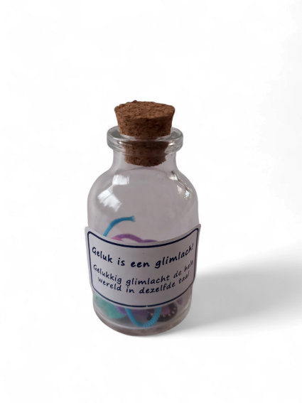 Op een kaartje in het flesje staat 'Geluk is een glimlach. Gelukkig glimlacht de hele wereld in dezelfde taal'.