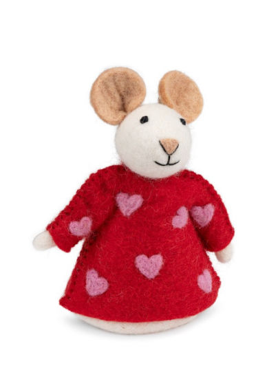 Decoratie muis "Sweetheart" in rood. Deze lieve vilten muis met hartjesjurk voegt een vrolijke en unieke sfeer toe aan je interieur. Perfect als decoratie of als cadeautje. Ca. 16 cm hoog, 11 cm doorsnede.