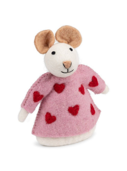 Decoratie muis "Sweetheart" in rood. Deze lieve vilten muis met hartjesjurk voegt een vrolijke en unieke sfeer toe aan je interieur. Perfect als decoratie of als cadeautje. Ca. 16 cm hoog, 11 cm doorsnede.