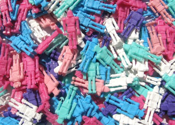 10 mini robotjes, plastic. In verschillende kleuren en uitvoeringen. Lengte 4,5 cm. Wordt assorti geleverd. Leuk als decoratie of uitdeelkadootje