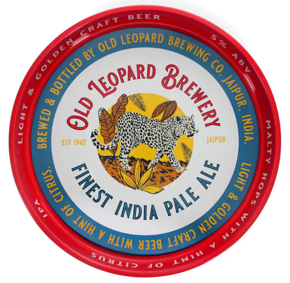 Een vrolijk dienblad van metaal. Ca. 31 cm in doorsnede, en met een opstaande rand van 3,8 cm.