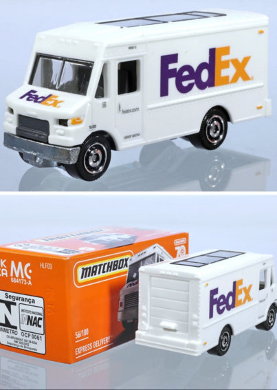 FedEx autootje van Matchbox. Lengte ca. 7,5 cm, breedte ca. 2,7 cm, hoogte ca. 3,4 cm.
