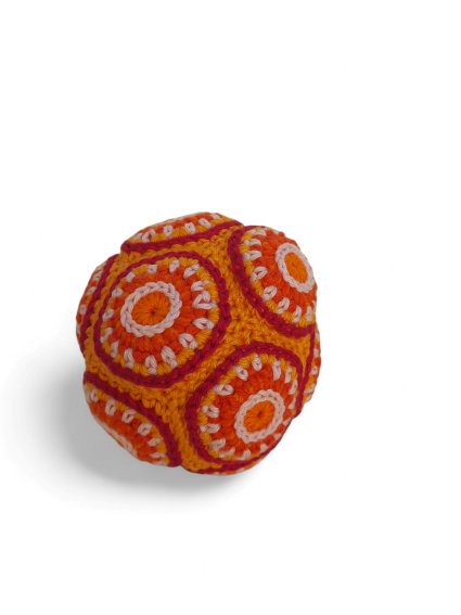 Handgemaakt van 100% gemerceriseerde katoen, met een belletje erin. Doorsnede ca. 10 cm.