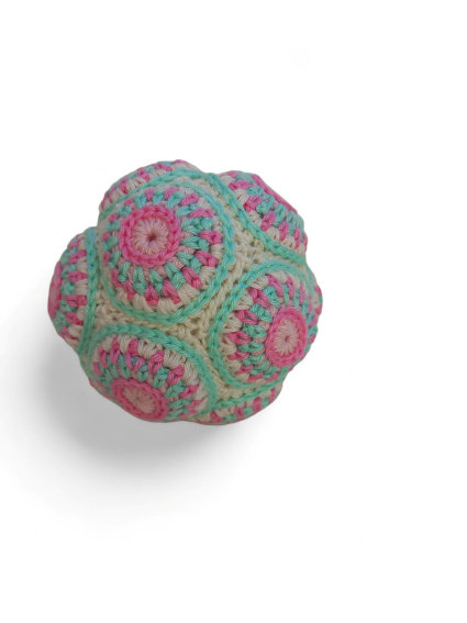 Handgemaakt van 100% gemerceriseerde katoen, met een belletje erin. Doorsnede ca. 10 cm.